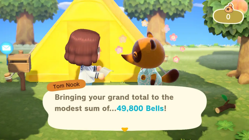 After landing, Tom Nook reveals your accomodation - a tent - and that you have inadvertently already got yourself into debt (from his perspective!). He tells you that the cost of your travel and moving has cost you some Nook Miles loyalty points, which you’ll need to pay back in order to move to the next stages of the game. He does give you the option to pay nearly ten times the amount in Bells instead, but it’s quicker to get the Miles.
